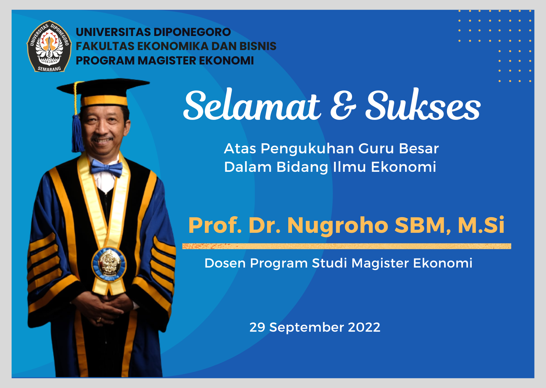 [et_pb_column type=”4_4″][et_pb_text admin_label=”Text”]Fakultas Ekonomika dan Bisnis (FEB) Universitas Diponegoro (UNDIP) kembali menyumbang guru besar melalui pengukuhan Prof. Dr. Nugroho Sumarjiyanto Benedictus Maria, Msi yang juga merupakan Dosen Program Magister Ekonomi. Dikukuhkan pada Kamis (29/09/2022), guru besar dalam bidang Ilmu Ekonomi tersebut mengusung pidato dengan judul Ekonomi Dan Korupsi: Dapatkah Indonesia Bebas Dari Korupsi?”