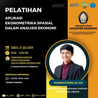 Program Magister Ekonomi Undip Kembali menyelenggarakan pelatihan ekonometrika spasial pada tanggal 27 Juli 2024. Pelatihan satu hari ini dimaksudkan untuk menjawab kebutuhan penggunaan alat analisis dalam penelitian berbasis spasial, khususnya penelitian ekonomi. Pelatihan ini adalah tindaklanjut dan sekaligus sebagai kesinambungan dari penelitian serupa yang dilakukan pada periode sebelumnya. Ekonometrika spasial adalah salah satu alat yang powerful untuk menganalisis ketergantungan spasial, salah satunya adalah bagaimana spillovers antar-wilayah terjadi. Pembangunan satu wilayah memberikan dampak kepada wilayah lain. Sebagai pembicara dalam pelatihan ini adalah Salman Fathoni, S.E., M.E., saat ini bekerja di Bank Indonesia Institute (BI Institute).
