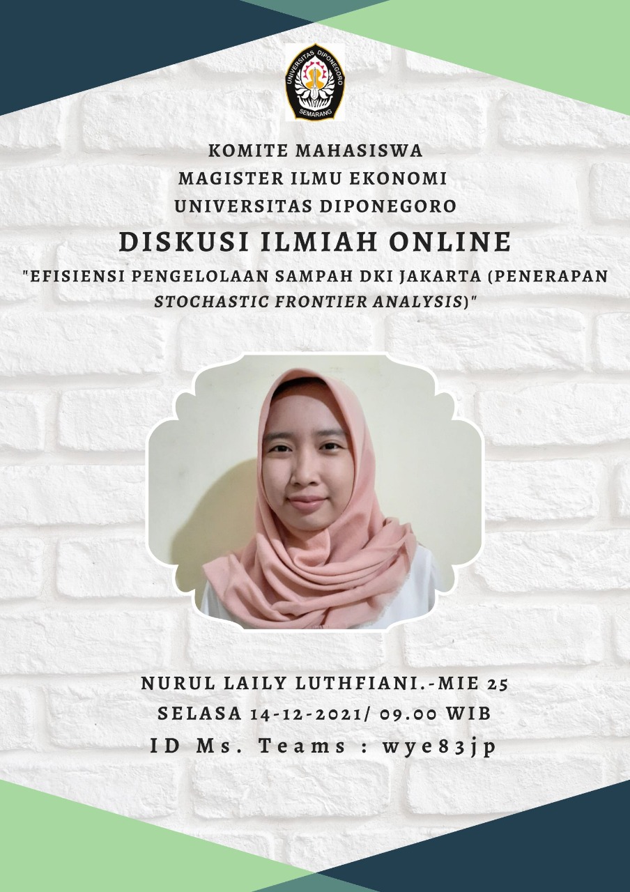 Master of Economics, Diponegoro University will hold a Scientific Discussion on Tuesday, December 14, 2021, at 09.00 WIB. The Scientific Discussion was delivered by Nurul Laily Luthfiani as a Master of Economics student batch 25 with the theme “DKI Jakarta Waste Management Efficiency (Application of Stochastic Frontier Analysis)”.
