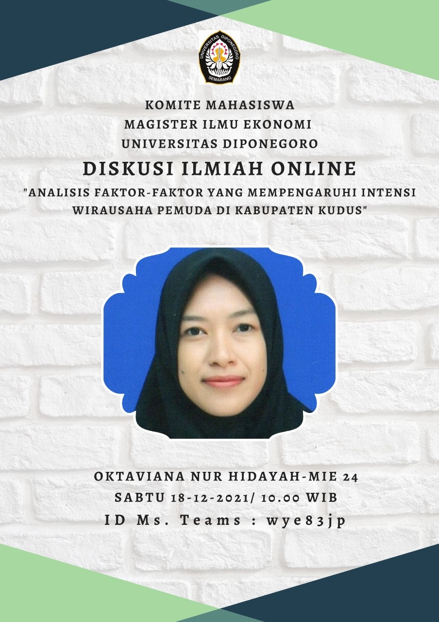 Master of Economics, Diponegoro University held a Scientific Discussion on Saturday, December 18, 2021 at 10.00 WIB. The Scientific Discussion was delivered by Oktaviana Nur Hidayah as a Master of Economics student batch 24 with the theme “Analysis of Factors Affecting Youth Entrepreneurial Intentions in Kudus Regency”.