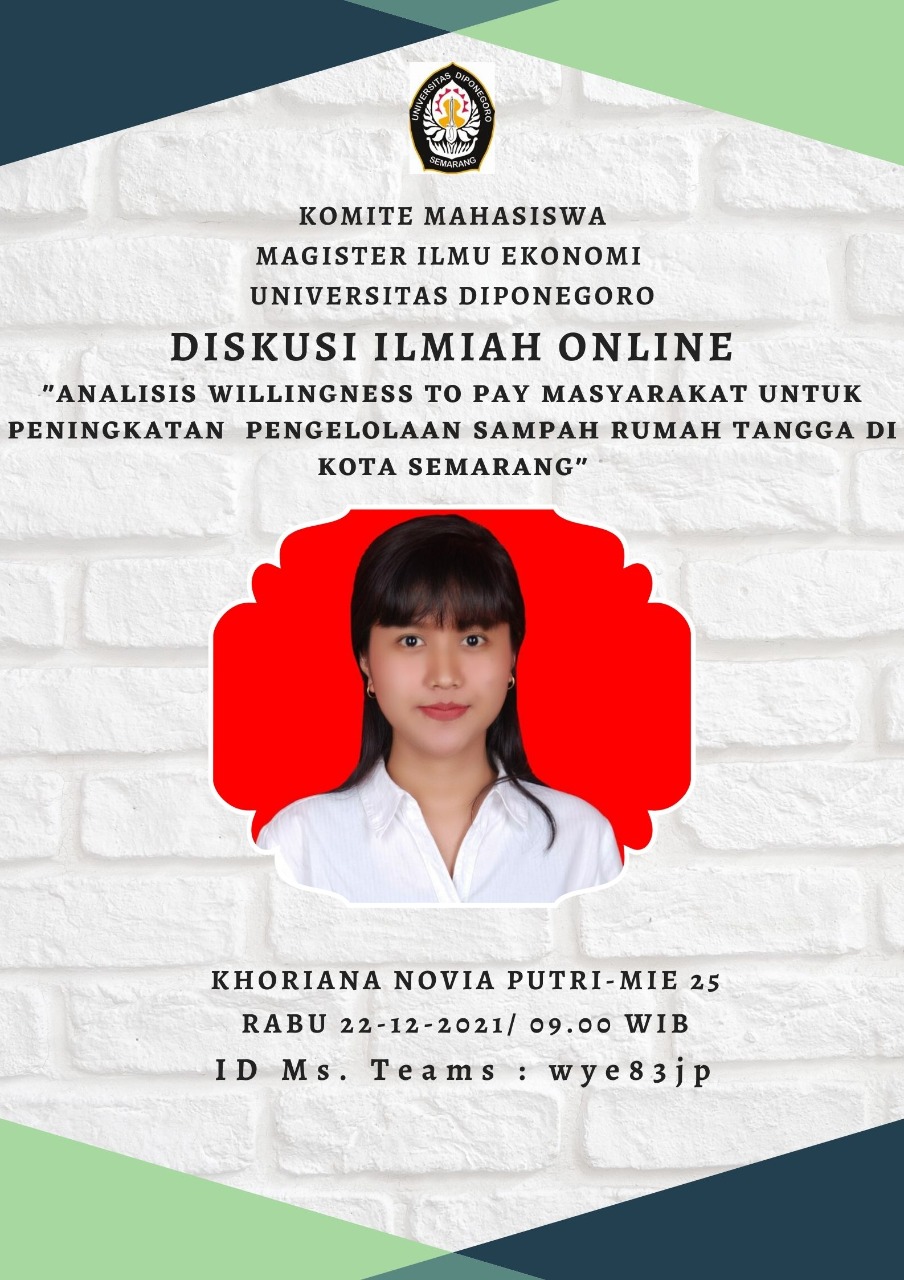 Master of Economics, Diponegoro University held a Scientific Discussion on Wednesday, December 22, 2021 at 09.00 WIB. The Scientific Discussion was delivered by Khoriana Novia Putri as a Master of Economics student batch 25 with the theme “Analysis of Community Willingness to Pay to Improve Household Waste Management in Semarang City”.
